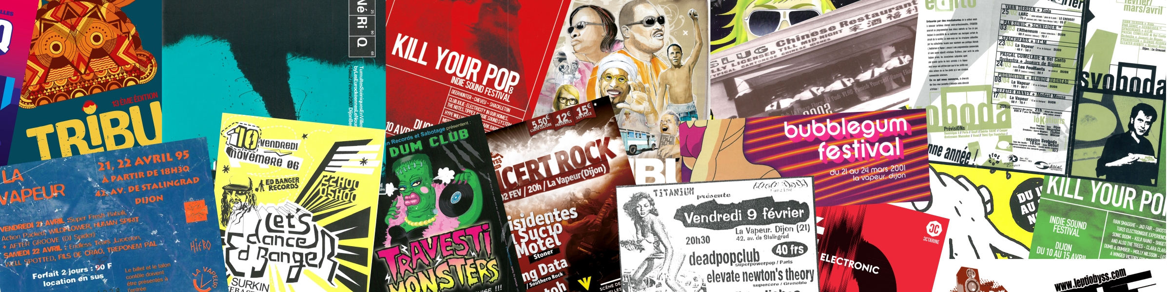 Julian Lagoutte, designer graphique dijonnais, s’empare des murs du foyer de La Vapeur et expose 30 ans de programmation et d’arts graphiques au travers des archives de la salle de concerts.